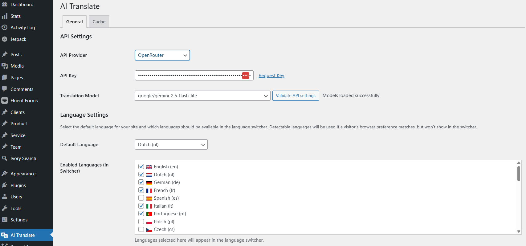 AI Translate uses a smart caching system that stores translations in WordPress and files. Translations are only regenerated when the original content changes. This saves API costs and improves your website speed.